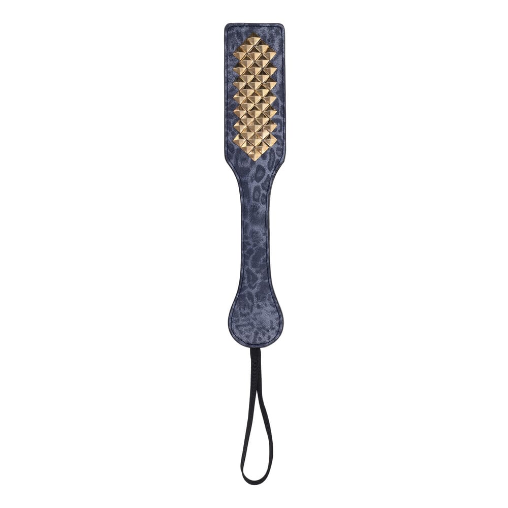 Deliver a playful sting with the Cougar Studded Paddle. Combining rich blue leopard-printed faux leather with gleaming gold studs, this paddle ensures each swat is both stylish and satisfying. Perfect for adding a bit of bite to your play, it’s designed for those who love to tease and tantalise.