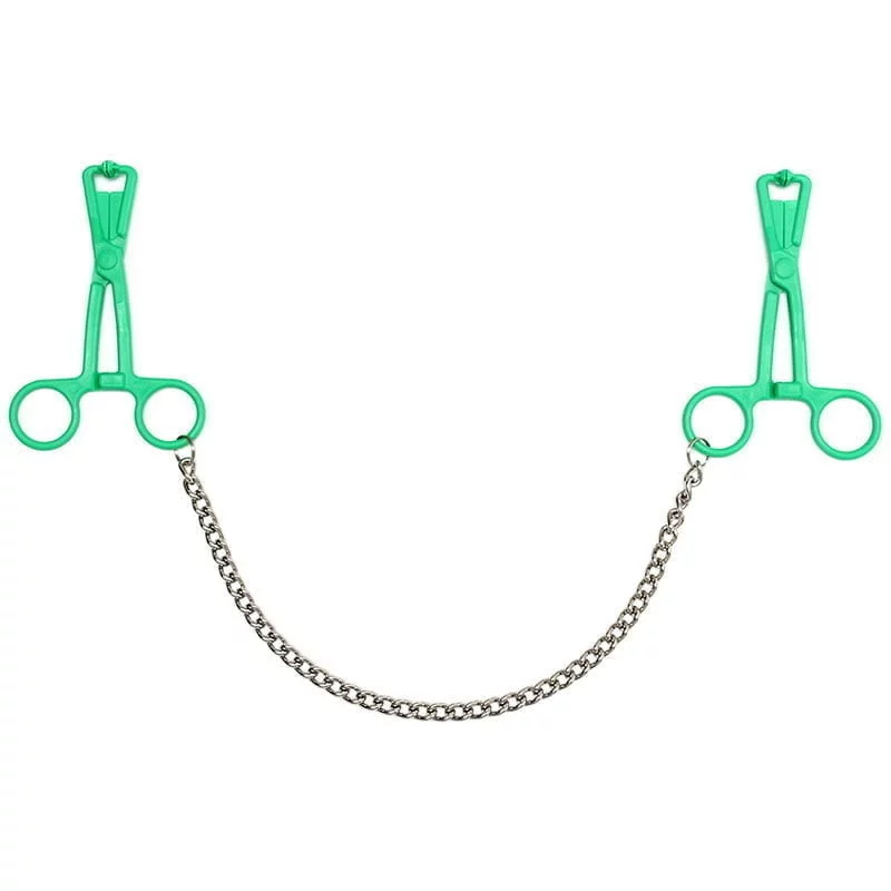 These Green Scissor Nipple Clamps are made from high-quality plastic, ensuring durability and safety during use. The clamps are joined by a robust 14-inch metal chain, which not only adds a visually appealing element but also allows for versatile play options. They are ideal for both beginners and experienced users looking to explore nipple stimulation in new ways.