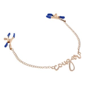 Dare to bare it all and add a touch of thrill to your play with the Cougar Nipple Clamps. These elegant clamps feature a luxurious gold chain with the word “Cougar” written in cursive between them, embodying both style and playfulness. Featuring adjustable tension, these clamps are perfect for exploring new sensations. The sultry blue hue adds a fierce edge, ensuring every moment is as stylish as it is stimulating.